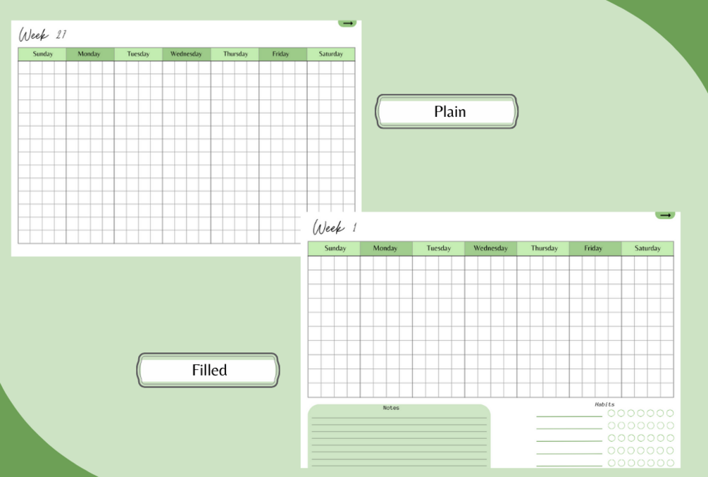 - Filled Weekly Planner: Dive into the organized bliss of our Filled Weekly Planner! This option is crafted with your busy schedule in mind. It includes a detailed weekly plan, habit tracker to cultivate positive routines, and a dedicated space for notes. Effortlessly manage your tasks, track your habits, and jot down important thoughts—all in one planner.